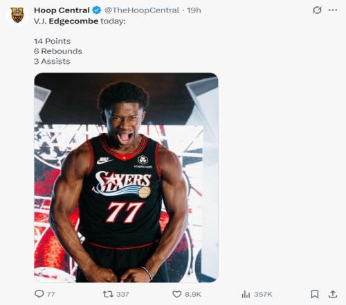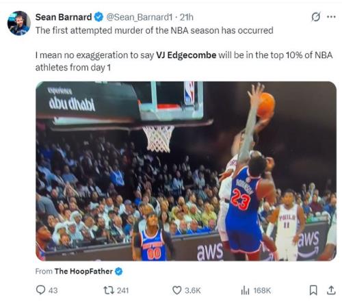 費(fèi)城記者Sean Barnard寫(xiě)道:NBA新賽季的第一場(chǎng)比賽就險(xiǎn)些出現(xiàn)了逆天隔扣,我毫不夸張的說(shuō),埃奇庫(kù)姆會(huì)成為NBA天賦排名前10%的球員。