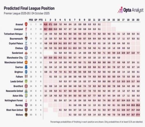 此役過后,數(shù)據(jù)機(jī)構(gòu) OPTA 超級計算機(jī)預(yù)測本賽季英超冠軍,阿森納以 41.6% 的概率捧杯,利物浦的奪冠概率為 35.7%,曼城則為 10.7%,切爾西的冠軍率僅為 2.0%。
