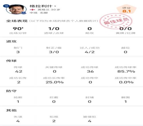 此役,埃弗頓攻擊手格拉利什首發(fā)并踢滿全場,在第93分鐘攻入絕殺進球,3次射門全部射正,4次嘗試過人兩次成功,42次傳球,成功率85.7%,防守端貢獻1次搶斷和1次解圍,還有4次被對手侵犯,賽后機器評分8.1分。