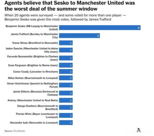 該媒體詢問了20位經(jīng)紀(jì)人,讓他們選出今夏最差引援,其中一些人投了不止一名球員。最終,謝什科獲得了6票,是所有球員中最多的,而排名第二的則是曼城門將特拉福德,他只有3票。其余被提到的球員還有吉滕斯、維薩、約克雷斯、維爾茨等。其中,備受爭議的維爾茨,僅拿到1票。