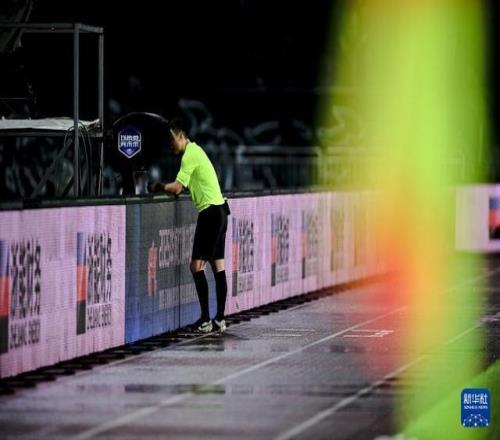 10月18日,主裁判孟祥昆在比賽中觀(guān)看VAR(視頻助理裁判)回放,并在觀(guān)看后判罰給山東泰山隊(duì)一粒點(diǎn)球。新華社記者 江漢 攝
