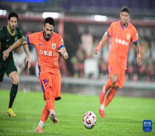 10月18日,山東泰山隊(duì)球員克雷?!ぐ腿逅梗ㄓ叶┰诒荣愔兄髁P點(diǎn)球命中。新華社記者 江漢 攝