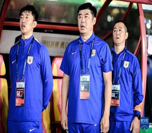 10月18日,山東泰山隊(duì)代理主教練韓鵬(中)在比賽前。新華社記者 江漢 攝