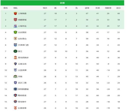在第27輪結(jié)束2個(gè)比賽日之后,中超積分榜可以說(shuō)是一夜變天,海港、蓉城和申花三強(qiáng)爭(zhēng)冠進(jìn)入白熱化,北京國(guó)安大崩盤徹底掉隊(duì);