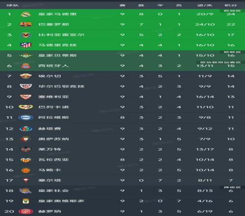 西甲第9輪結(jié)束了9場(chǎng)比賽,最新積分榜如下!