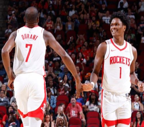 在火箭,杜蘭特的“三巨頭”同伴是中鋒申京和側(cè)翼阿門-湯普森。申京是約基奇式的技術(shù)型傳球手,上賽季首次入選全明星,并在今年休賽期贏得了歐洲杯的銀牌。阿門-湯普森是一名防守悍將,今年秋天被NBA總經(jīng)理們投票選為最有可能迎來(lái)爆發(fā)賽季的球員。