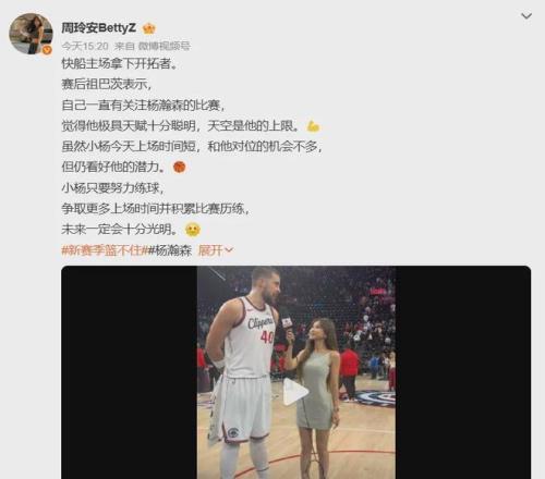 賽后,此役砸出21分8板3助2帽全面數(shù)據(jù)的快船首發(fā)核心中鋒祖巴茨,對與自己有著短暫對位的楊瀚森進行了點評,表示:“我一直在看他的一些比賽,非常有天賦,只需努力訓練,但非常遺憾本場沒怎么看到其的發(fā)揮?!?/p>