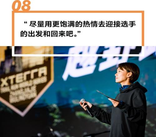 早上五點(diǎn)過,主持人小美已經(jīng)在比賽現(xiàn)場做好準(zhǔn)備等待著選手們的到來。對于保持主持人充沛狀態(tài)的秘訣,她表示自己曾經(jīng)做鐵三和越野選手的時(shí)候,如果現(xiàn)場的MC、志愿者們能給到她很多的熱情,那將會(huì)讓她更加充滿能量。所以當(dāng)自己做主持人的時(shí)候,她也想以自己的最大力量讓這些選手們感受到熱情和支持。