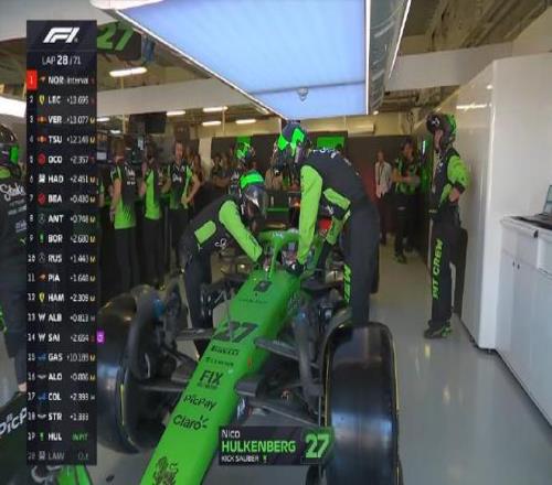 第二十八圈:塞恩斯因在維修區(qū)超速被罰時(shí)5秒,霍肯伯格賽車出現(xiàn)問題直接選擇退賽