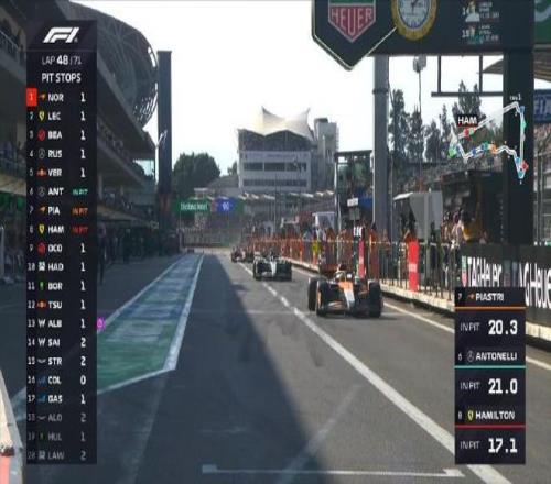 第四十八圈:安東內(nèi)利、皮亞斯特里和漢密爾頓同時(shí)進(jìn)站,邁凱倫賽車率先出站在維修區(qū)完成超越