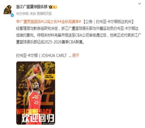 北京時(shí)間11月5日,CBA衛(wèi)冕冠軍廣廈男籃官宣,球隊(duì)與上賽季的總冠軍大外援卡爾頓達(dá)成續(xù)約,他新賽季回歸球隊(duì)繼續(xù)助力球隊(duì)去沖擊2連冠。