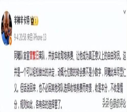 媒體人“半神半卡特”發(fā)文點(diǎn)評:這并不是一個(gè)可以輕松做出的決定,動(dòng)輒七位數(shù)的轉(zhuǎn)會(huì)費(fèi)不是小數(shù)字,同曦此舉盡顯仁義。但話說回來,也不必因其他球隊(duì)選擇收培養(yǎng)費(fèi)而苛責(zé),收是本分,不收是情分,規(guī)則如此,各有各的選擇罷了。