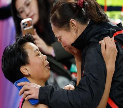 計時器定格在12秒81,奪冠,創(chuàng)造個人最好成績。她跑向看臺,與媽媽相擁,輕撫媽媽的臉龐,為她拭去激動的淚水。