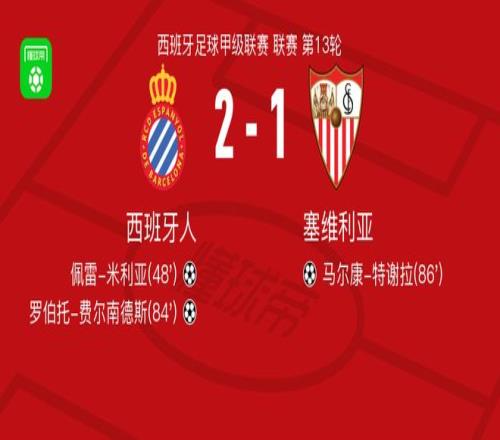 北京時間11月25日,西班牙足球甲級聯(lián)賽第13輪展開角逐,西班牙人坐鎮(zhèn)主場迎戰(zhàn)塞維利亞。比賽中,西班牙人率先打破僵局,佩雷-米利亞接多蘭的助攻后破門得分,為主隊取得領先。隨后,烏爾科-岡薩雷斯送出助攻,羅伯托-費爾南德斯冷靜施射建功,進一步擴大比分優(yōu)勢。臨近比賽尾聲,塞維利亞由加布里埃爾-蘇亞索助攻馬爾康-特謝拉扳回一球,但未能扭轉局勢。最終,西班牙人以2比1戰(zhàn)勝塞維利亞,全取三分。
