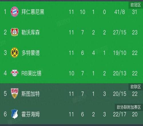 德甲積分榜,拜仁讓二追六,8分領(lǐng)跑,多特33遭絕平,仍居第三