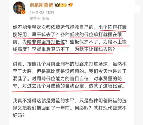那么,中國男籃為何會輸給韓國隊呢?對于這個問題,也是有很多人進行了討論,CBA名記“別跑剛背豬”認為,中國男籃之所以會輸球,球隊主教練郭士強要負主要責任,是他用人不當,是他戰(zhàn)術有問題,才是導致中國男籃輸球的關鍵原因。