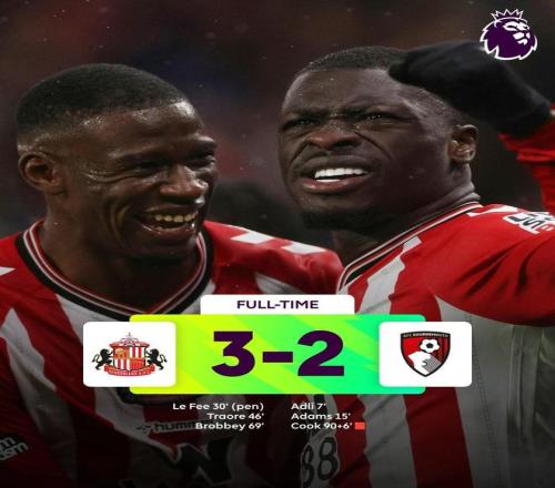 此役主場(chǎng)對(duì)陣伯恩茅斯,作為升班馬的桑德蘭在開場(chǎng)15分鐘便0-2落后,隨后桑德蘭憑借憑借勒費(fèi)埃、伯特蘭-特拉奧雷和布羅貝伊各入一球,3-2逆轉(zhuǎn)擊敗對(duì)手。