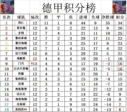 德甲最新積分戰(zhàn)報(bào)輸給拜仁后4勝1平門興5輪不敗沖進(jìn)上半?yún)^(qū)