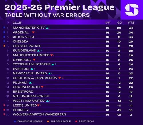 去掉有爭(zhēng)議的VAR判罰后的英超積分榜(球隊(duì)/積分/凈勝球)