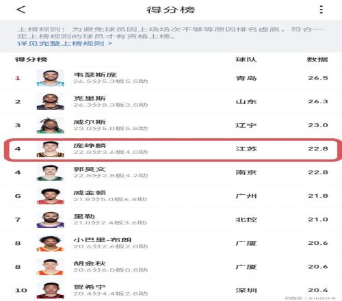 值得關注的是,本賽季截止前5輪,作為選秀大會探花簽的龐崢麟,場均22.8分3.6籃板4助攻,投籃命中率59.4%、三分命中率50%。而場均22.8分,排在全聯(lián)盟第4位。對于一名CBA一年級生來講,這表現(xiàn)堪稱逆天。