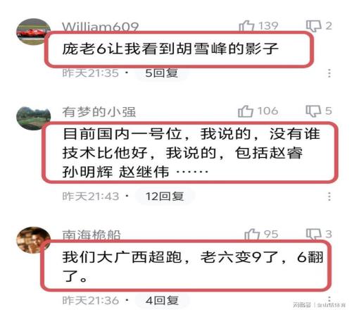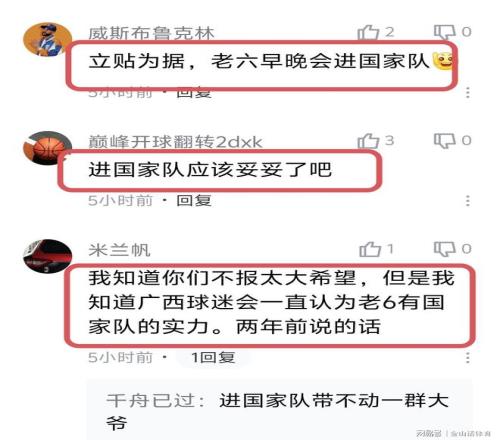 許多網友紛紛表示,龐崢麟應該進國家隊?!傲①N為據,老六早晚會進國家隊”;“進國家隊應該妥妥了吧”;“我知道你們不抱太大希望,但是我知道廣西球迷會一直認為老6有國家隊的實力。兩年前說的話?!?;“事實證明國家選材有很大問題,基本功好才是王道,選才應從各方面來考慮,而不是以身高或者出身來選?;竟Ρ仨毰诺谝?,基本功若是不好,要么傳不好,要么別人傳給你接不住?!?;“我們廣西狼兵,只要出去的,就沒有一個差勁的,以前有朱八,現(xiàn)在有老六,還有廖三?!?;“這才是樂透選秀的價值?!薄?/p>