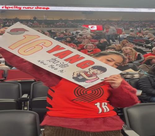 “一起進(jìn)來的二三十個(gè)孩子們(從各地飛來波特蘭看楊瀚森的華人球迷)要買球衣,要找楊瀚森簽名,孩子買球衣的時(shí)候,不是一件一件買,是一堆一堆買,(一個(gè)人)一千多刀,經(jīng)理眼都直了,售貨員眼都直了,來這樣買球衣的,除了楊瀚森的球衣這樣賣過,沒有一個(gè)球員的球衣是這樣賣的?!?/p>