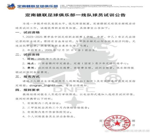 毛彪點(diǎn)兵!定南贛聯(lián)發(fā)試訓(xùn)公告,年齡無上限,但須有聯(lián)賽出場(chǎng)記錄