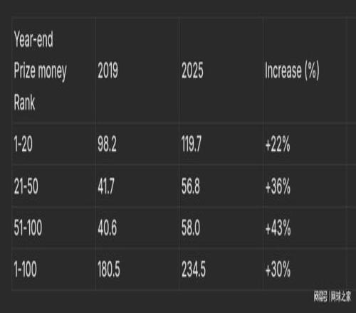 在過(guò)去六年里,ATP前20名球員的獎(jiǎng)金僅增長(zhǎng)了22%。但從2019年11月到2025年11月,美元通脹率達(dá)到了26%。這意味著,世界頂級(jí)球員的實(shí)際收入反而低于2019年。