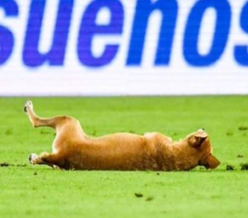 比賽過程中,客隊(duì)后衛(wèi)帕切科受傷倒在地上,這時(shí)候有一只狗跑上了球場,在看到球員倒在地上的姿勢之后,它也順勢躺在球場上,旋轉(zhuǎn)著模仿他摔倒的動(dòng)作。