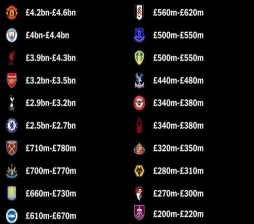 12月27日,TA發(fā)布了英超各支球隊的估值情況,這份榜單由TA查看了英超各家俱樂部的財務情況,并且綜合了相關數(shù)據(jù),其中包括Football Benchmark、福布斯、Kinnaird和Sportico等相關媒體的數(shù)據(jù),給出的這份榜單,還是具備一定的權(quán)威性的。在這份榜單當中,曼聯(lián)以46億英鎊的估值領跑英超,排名第2的則是曼城的44億英鎊,緊隨其后的是43億的利物浦,這也是所有超過40億英鎊的英超俱樂部。