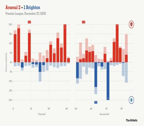 阿爾特塔斷言阿森納本該終結(jié)比賽懸念,這是正確的。他的球隊射門數(shù)以24比8遙遙領(lǐng)先,這反映在下方的進球概率圖中,該圖使用了包括預期進球值在內(nèi)的多種指標。
