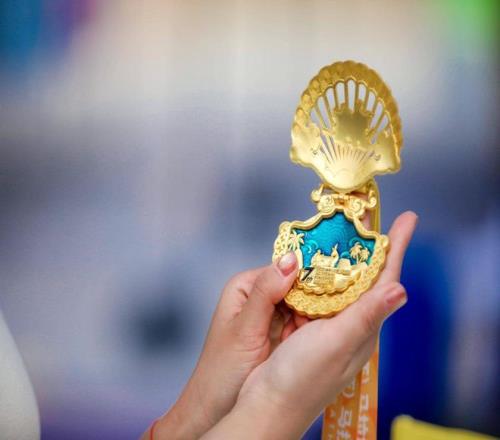 獎牌正面大面積鏤空通透如浪,啟合間可窺見天涯海角、鹿回頭、南天一柱等三亞地標(biāo)盛景,搭配可拆卸海螺造型磁吸配件,既可與獎牌融為一體彰顯榮譽(yù),也可單獨作為冰箱貼使用,兼具紀(jì)念意義與實用價值。