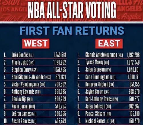 2026年NBA全明星球迷投票首輪結(jié)果出爐,東契奇領(lǐng)跑全聯(lián)盟(票王),字母哥東部第一。而作為聯(lián)盟老牌球星的代表,庫里拿到100多萬票,排在西部第三;杜蘭特則以差不多55萬票排在西部第八,詹姆斯則以差不多54萬票僅排在西部第九。東道主的哈登則只有21.5萬票排在西部第12位,萊昂納德只排在第20。