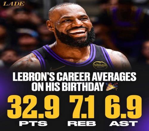 詹姆斯正式年滿41周歲,作為現(xiàn)役最老的球員依然肩負(fù)率領(lǐng)湖人前進(jìn)的重任。在詹姆斯生涯前10次NBA生日之戰(zhàn),他場(chǎng)均得到32.9分成為NBA生日夜場(chǎng)均得分最高的球員,力壓威爾金斯場(chǎng)均32.7分與庫(kù)里、奧尼爾場(chǎng)均29.4分。