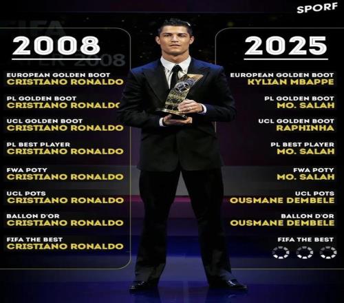 2008vs2025獎(jiǎng)項(xiàng)對(duì)照榜:C羅一人包圓!姆巴佩薩拉赫只能分著拿