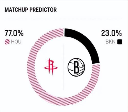 賽前,美媒ESPN對(duì)本場(chǎng)比賽進(jìn)行了預(yù)測(cè),火箭勝率高達(dá)77.0%,籃網(wǎng)隊(duì)勝率僅有23.0% ,差距非常明顯。