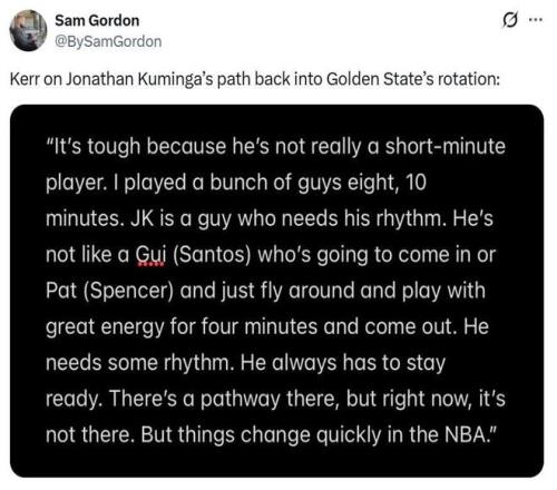 本場比賽庫明加又鬧出幺蛾子,在比賽即將開打之際,勇士隊官方突然宣布庫明加因為下背部酸痛缺席比賽。