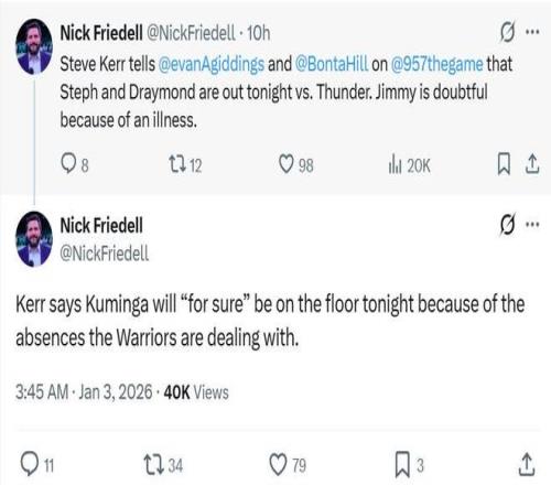 并且是在比賽開始前不久才做出決定,原本只有追夢一人在昨天確定輪休,結(jié)果在比賽開打前,巴特勒突然宣布因病缺席本場比賽,這種情況下,勇士隊果斷讓小腿存在傷病隱患的庫里也一起輪休。