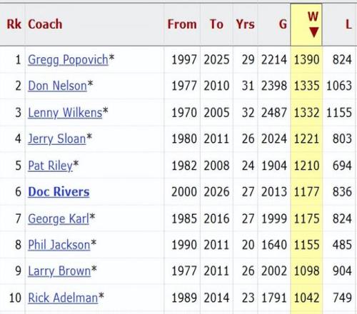 卡萊爾的生涯獲勝場數(shù)依然是999勝,連續(xù)12場敗北,讓他繼續(xù)無緣千勝里程碑。在NBA歷史上,目前一共有10位教練取得至少1000場勝利,排在首位的是波波維奇(1390勝),現(xiàn)役主教練中,只有雄鹿的老里弗斯在列,他獲得1177勝,在勝場排名中位列歷史第6。