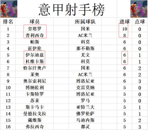 射手榜方面,勞塔羅10球領(lǐng)跑,普利西奇8球位列第2,伊爾迪茲今天錯(cuò)失多次機(jī)會(huì),被今天梅開二度的杜維卡斯追上,他們和霍伊倫,恰爾汗奧盧,萊奧,奧爾索利尼等人6球并列第3。