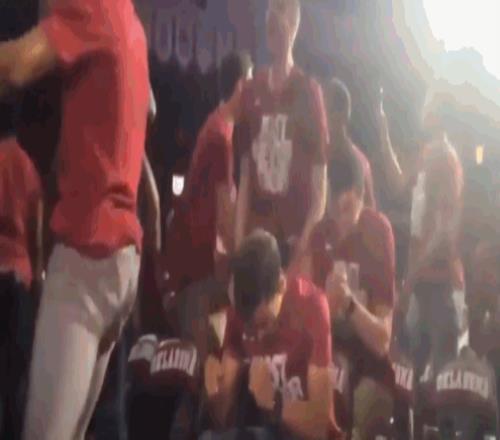 當(dāng)年NCAA錦標(biāo)賽的分區(qū)對(duì)陣揭曉直播中,楊所在的俄克拉荷馬大學(xué)處于晉級(jí)邊緣,球隊(duì)全程被鏡頭記錄。當(dāng)?shù)弥蜿?duì)成功入圍時(shí),所有隊(duì)員都起身相互慶?!í?dú)楊沒有。當(dāng)然,他也很開心,但與眾不同的是,隊(duì)友們都圍繞著他慶祝,而非與他一同慶祝,這一場(chǎng)景格外引人注目。