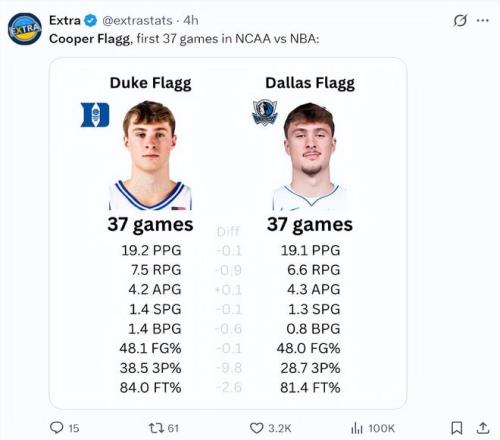 數(shù)據(jù)媒體曬出了弗拉格杜克大學(xué)前37場(chǎng)比賽與NBA前37場(chǎng)的數(shù)據(jù)對(duì)比,這個(gè)差距非常之效,NBA場(chǎng)均19.1分6.6籃板4.3助攻1.3搶斷0.8蓋帽,命中率48%,三分命中率28.7%。