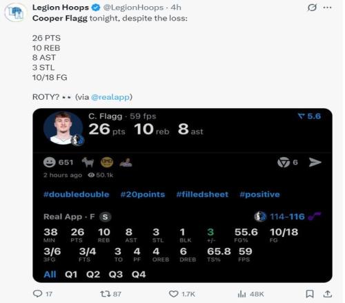 庫珀-弗拉格是獨(dú)行俠唯一的非賣品,他本場(chǎng)比賽的個(gè)人表現(xiàn)是非常出色的,全場(chǎng)比賽38分鐘,18中10,三分6中3,罰球4中3,拿到26分10籃板8助攻3搶斷1蓋帽,命中率55.6%,三分命中率50%,弗拉格的個(gè)人表現(xiàn)沒有受到外界的流言侵?jǐn)_,因?yàn)椴还芮蜿?duì)怎么變他都是未來的建隊(duì)基石。