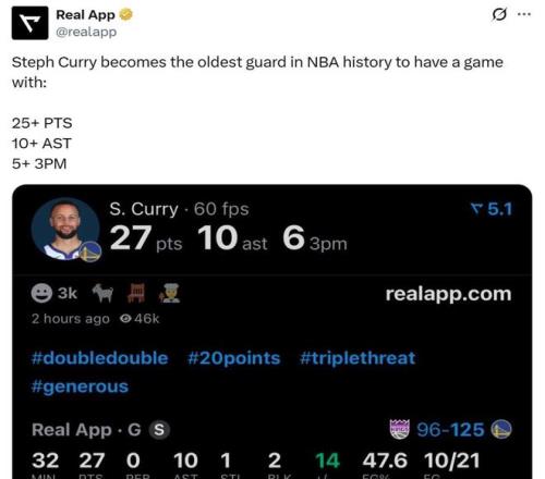 憑借這樣的表現(xiàn),37歲302天的庫里成為NBA歷史上單場砍下至少25分10助且命中至少5記三分最年長的后衛(wèi)。