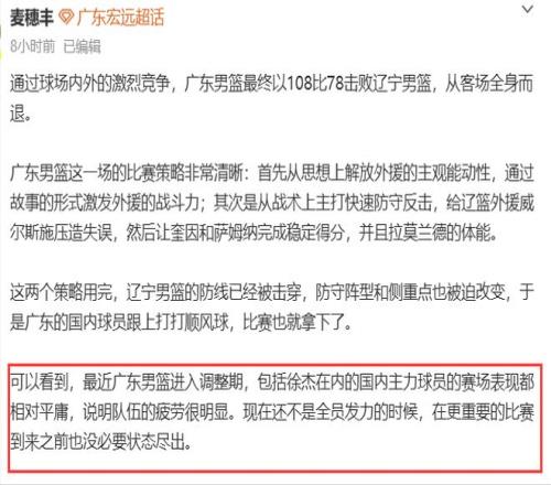 最后一點,不妨來看看廣東媒體人“麥穗豐”的見解,麥記認為:廣東隊這場比賽的策略非常清晰,首先從思想上解放外援的主觀能動性,通過故事的形式激發(fā)外援的戰(zhàn)斗力;(賽前奎因薩姆納薩林杰都接受了關于遼粵“宿敵之戰(zhàn)”的媒體采訪,薩姆納表示他喜歡打宿敵戰(zhàn),尤其是客場,奎因則干脆認為遼粵不算宿敵,因為遼寧只有3冠,廣東11冠)。