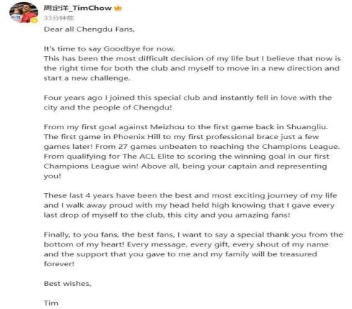 中超轉(zhuǎn)會(huì)動(dòng)態(tài):周定洋發(fā)文告別成都蓉城,已與保級(jí)隊(duì)完成簽約