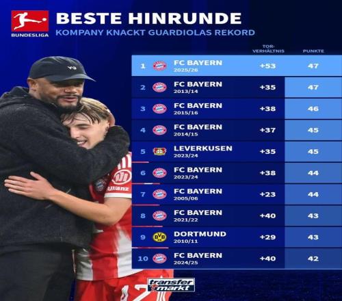 拜仁慕尼黑本賽季創(chuàng)下了德甲歷史上半程最佳戰(zhàn)績紀錄,德轉(zhuǎn)列出了德甲歷史上半場最佳戰(zhàn)績前十,拜仁獨占八席,勒沃庫森和多特各一席。
