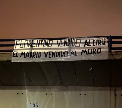 有球迷指責(zé)主帥,有球迷指責(zé)球員,還有球迷指責(zé)弗洛倫蒂諾。COPE電臺(tái)報(bào)道,在M-30高速公路和布爾格斯公路進(jìn)入馬德里的入口處,球迷掛橫幅抗議佛爺,表達(dá)不滿。