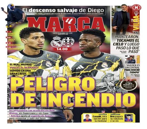 北京時間1月17日21:00,西甲聯(lián)賽第20輪,在經(jīng)歷了錯失西班牙超級杯冠軍、西班牙國王杯以及主教練哈維-阿隆索下課后,皇馬將重返伯納烏球場迎戰(zhàn)萊萬特。早些時候,《馬卡報》發(fā)布今日頭版封面,貝林厄姆、維尼修斯出鏡,標(biāo)題為:伯納烏球場的“火災(zāi)隱患”。