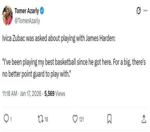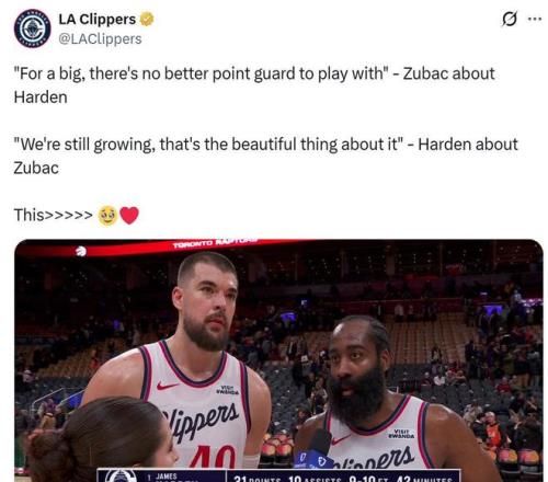 賽后祖巴茨也點(diǎn)名感謝哈登:“自從哈登加盟以來,他幫助我打出最好的籃球,對(duì)于大個(gè)球員來說,沒有比他更好的控衛(wèi)了?!?/p>